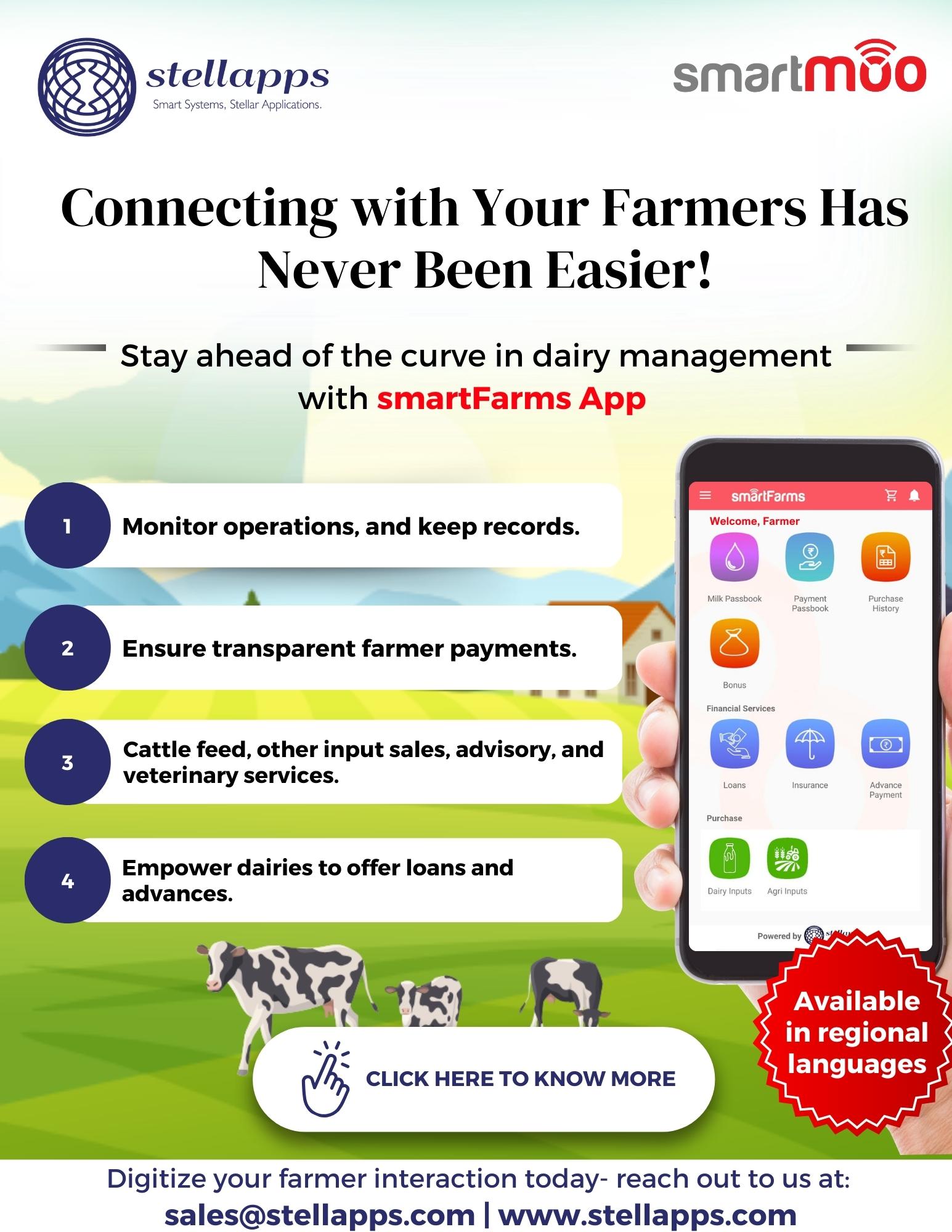 We digitize & optimise Milk Production, Milk Procurement & Coldchain Management through SmartMoo™ platform (Full Stack IoT solution) which helps dairy farmers and cooperatives maximize profits while minimizing effort. Currently, the SmartMoo™ platform & suite of apps touch over two billion liters of milk annually. SmartMoo™ IoT Platform is the first step towards creating measurable value for all stakeholders including farmers. It provides measurable data for cattle insurance. The SmartMoo™ Cloud is capable of supporting data arising out of tens of millions of liters of milk through the milk production, procurement and cold chain flow across millions of farmers.